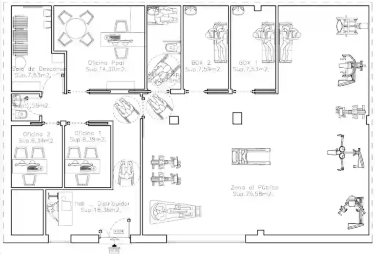 El programa era ambicioso: una sala principal amplia para ejercicio, dos oficinas, box individuales para tratamientos y un aseo adaptado cumpliendo normativa.